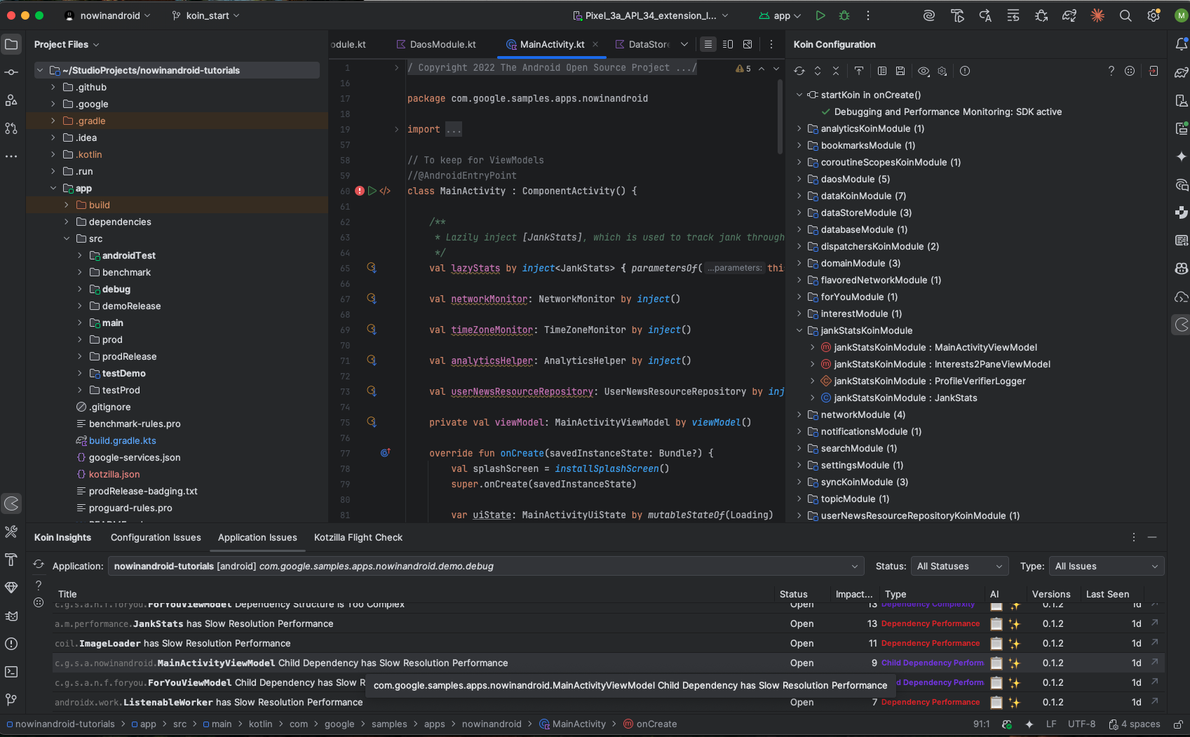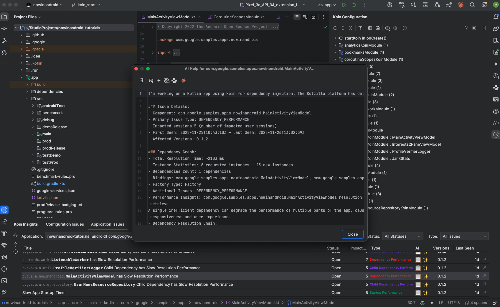 With the simulated delay in place, we will use the Koin IDE Plugin to visualise dependency resolution issues detected by the platform and affecting the performance. Open the Issues Panel in the Koin IDE Plugin and navigate to the Application Issues section.