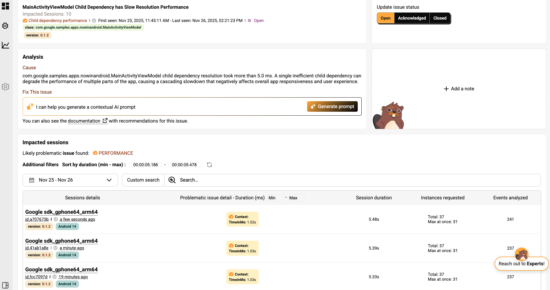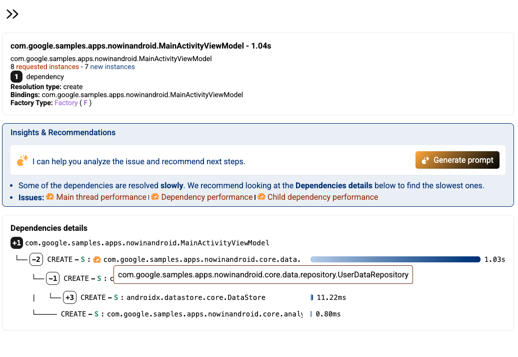 You can then fix the issue using Kotzilla’s contextual prompt generation with your AI coding assistant, or follow recommended manual actions. Optimizing this single child dependency leads to faster dependency resolution, smoother screen transitions, and an overall improved user experience.