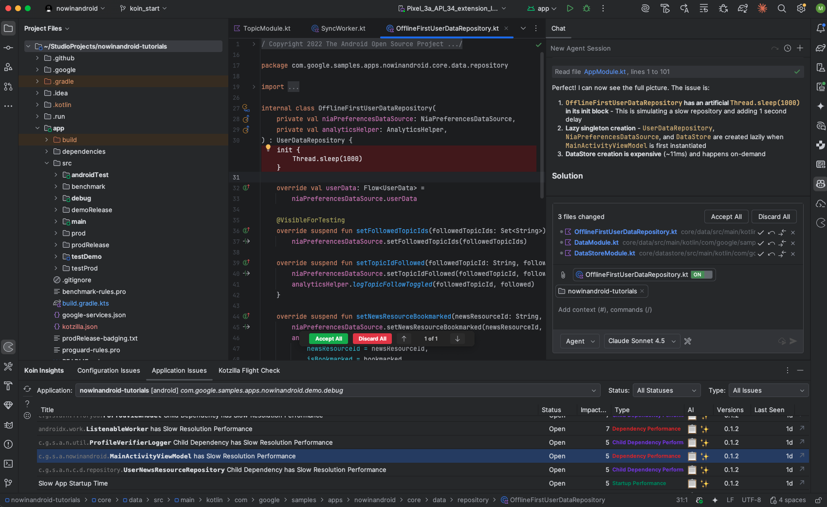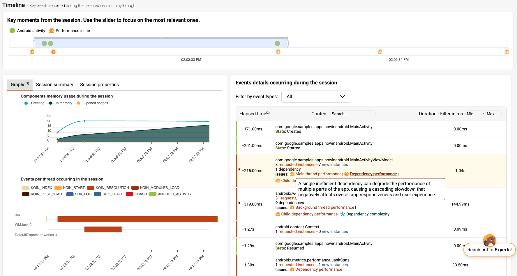 By simulating a 1-second delay in OfflineFirstUserDataRepository, we reproduced a slow child dependency resolution and observed how it propagates to MainActivityViewModel, blocking the main thread and slowing down screen transitions. Using the Kotzilla Platform and Koin IDE Plugin, we analyzed impacted sessions, visualized the dependency tree, and pinpointed which child dependencies caused the performance bottleneck.