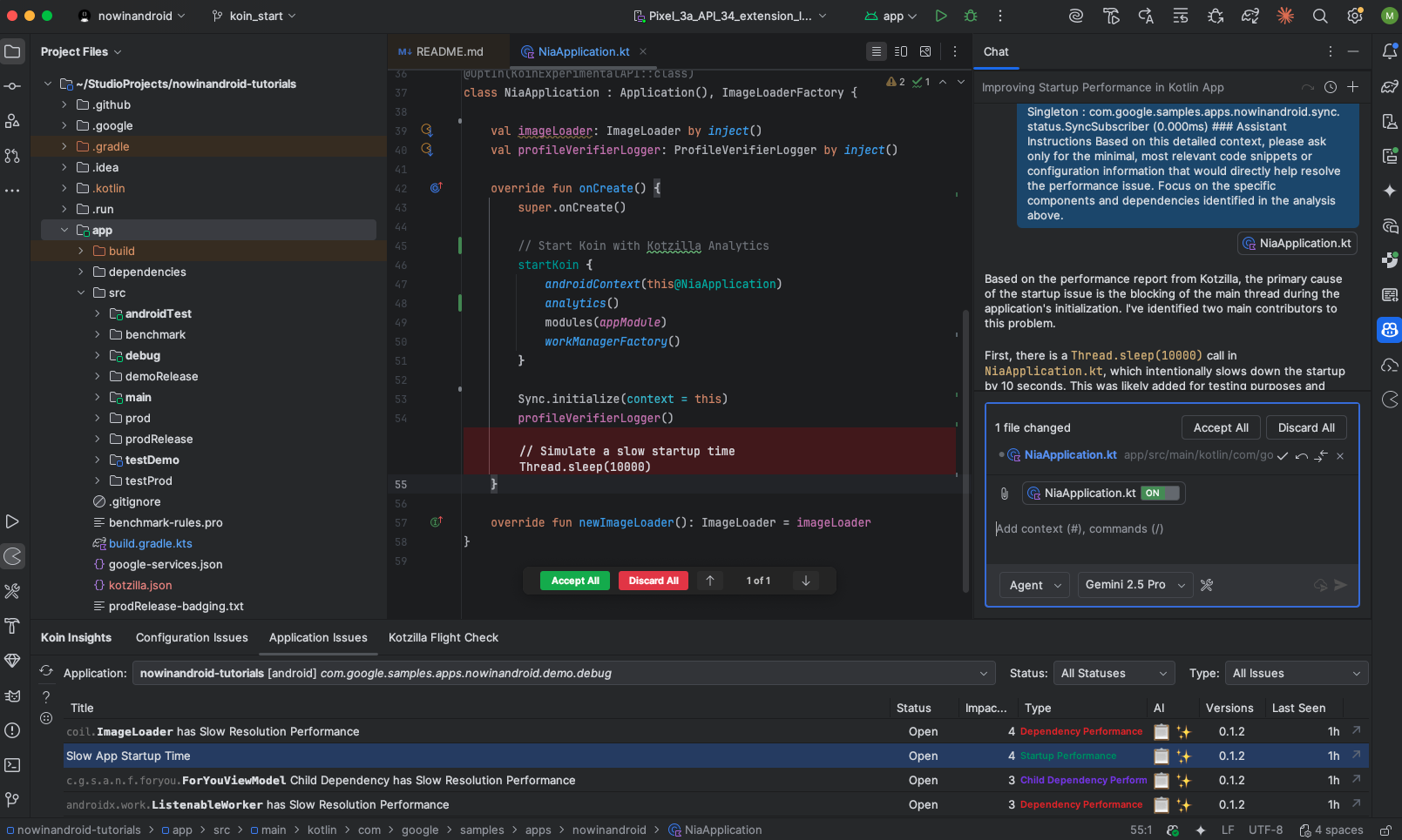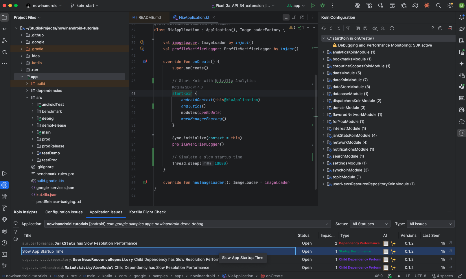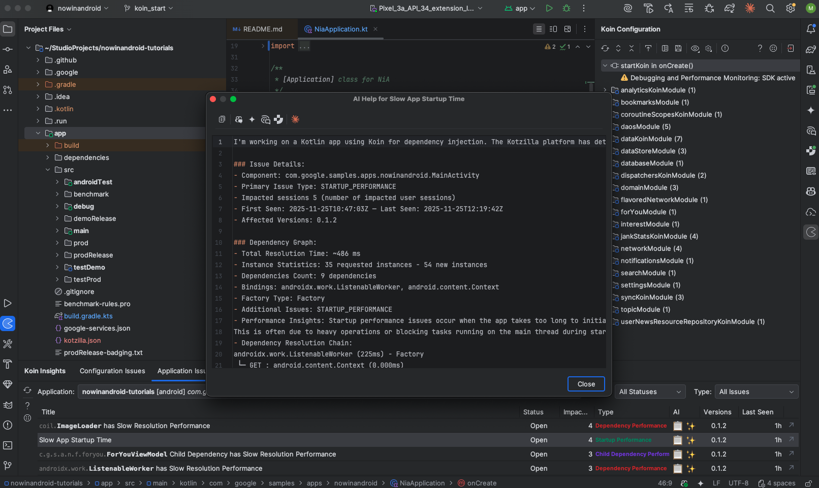 By simulating a 10-second delay in NiaApplication, we reproduced a slow startup and saw how it delays the first usable screen. Using the Koin IDE Plugin and the Kotzilla Platform, we detected the issue, inspected the impacted sessions, and identified the exact blockage between Koin module loading and MainActivity creation.