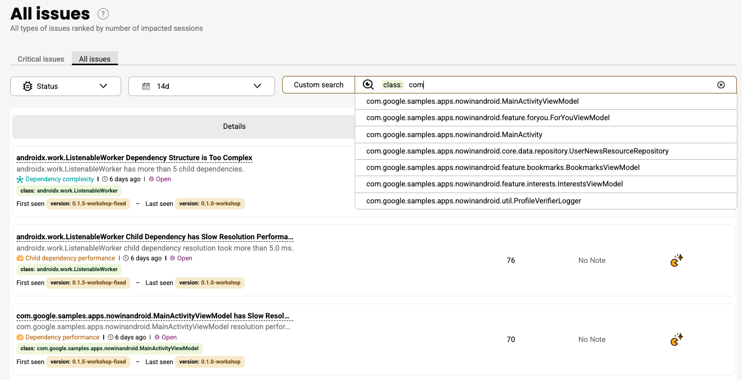 The page is composed of two views, allowing you to focus on critical issues or to get an overview of all issues detected. Both views include the complete list of issues, with filtering options by app version, issue type, impacted class, and full-text search across properties. For each issue, the view displays key information: