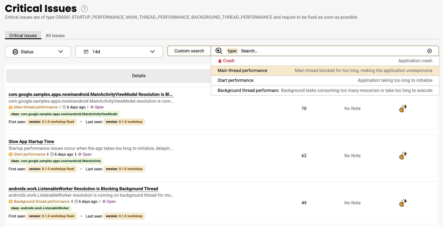 This view displays issues from the following types: Crashes, Startup performance, Main thread performance or Background thread performance.