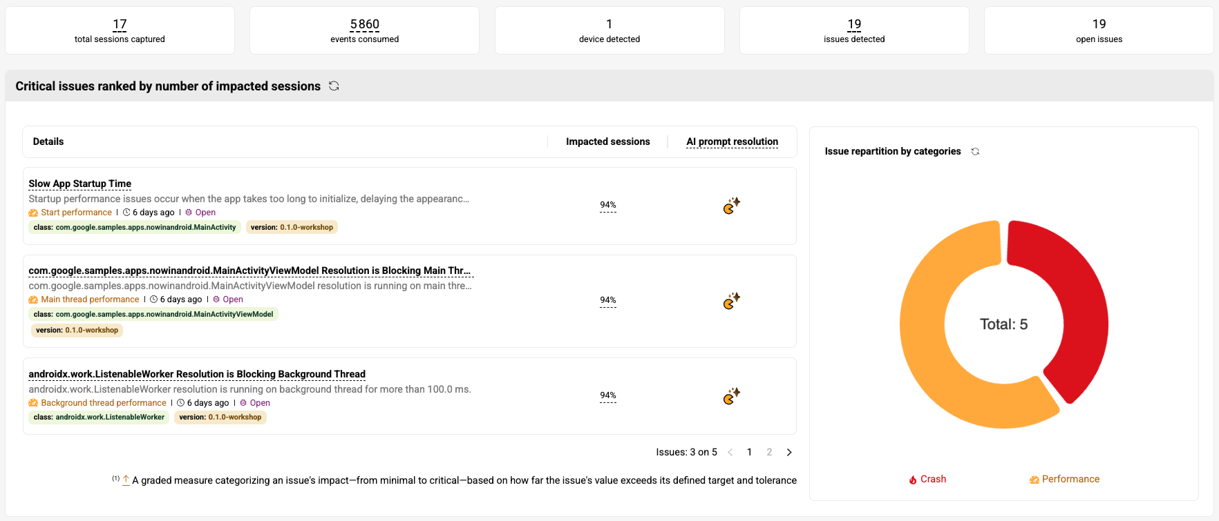 Displays critical issues sorted by impacted user sessions for a particular app version. These are the main issues that require immediate attention, as they are already affecting the user experience