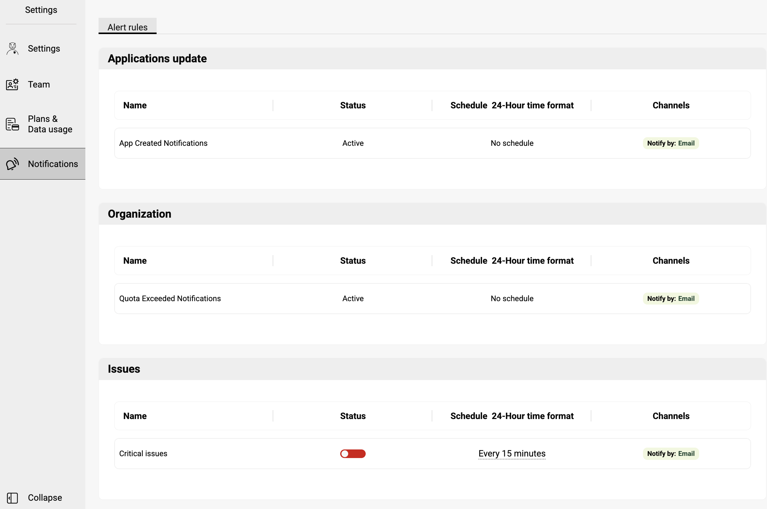 - The schedule of notifications is configurable, ranging from every 15 minutes up to once per month.