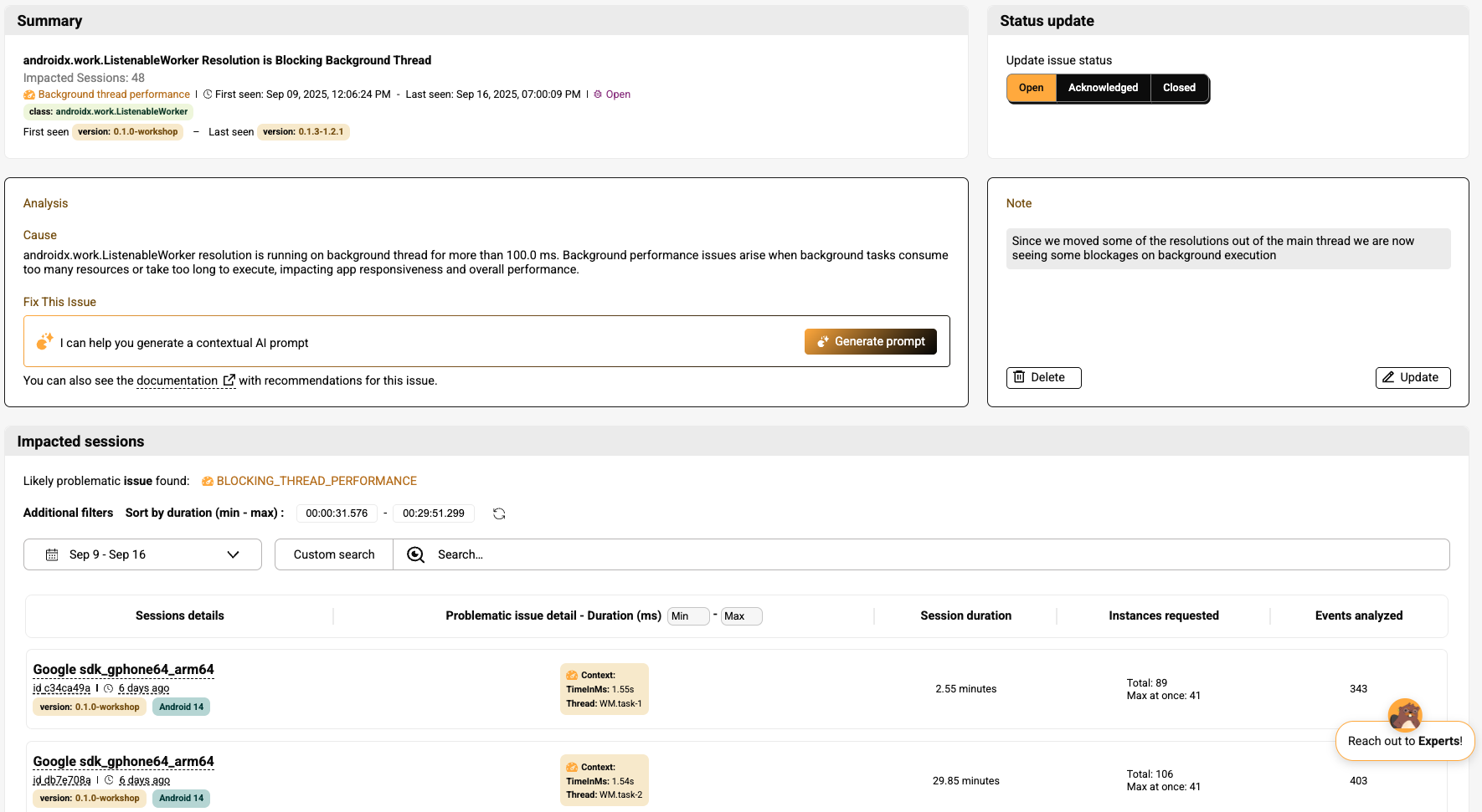 You can click on any issue to view detailed information such as stack traces for crashes, or explanations on the cause of the issue for performance, memory and app complexity problems. The issue details view also shows impacted user sessions, allowing you to continue the investigation down to specific user sessions