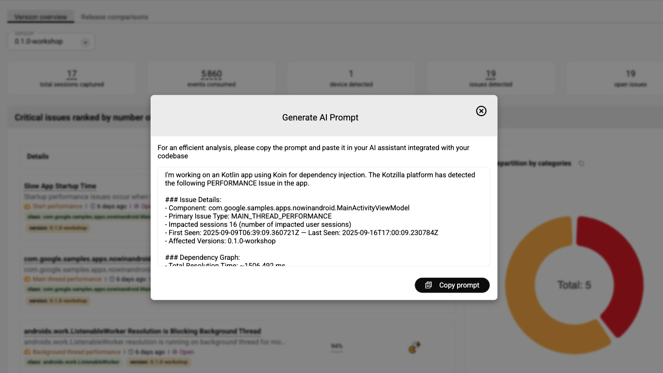 For each detected issue, the Console allows you to generate AI-powered contextual prompts directly from all main views (Dashboard, Issues, Issue Details, and Timeline). These prompts provide your AI coding assistant with the exact context needed to accelerate root cause analysis and implement fixes.