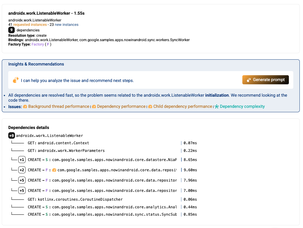 - Main thread performance issues: Components or dependencies resolutions running on the main thread for over 100ms, potentially leading to freezes or ANRs.