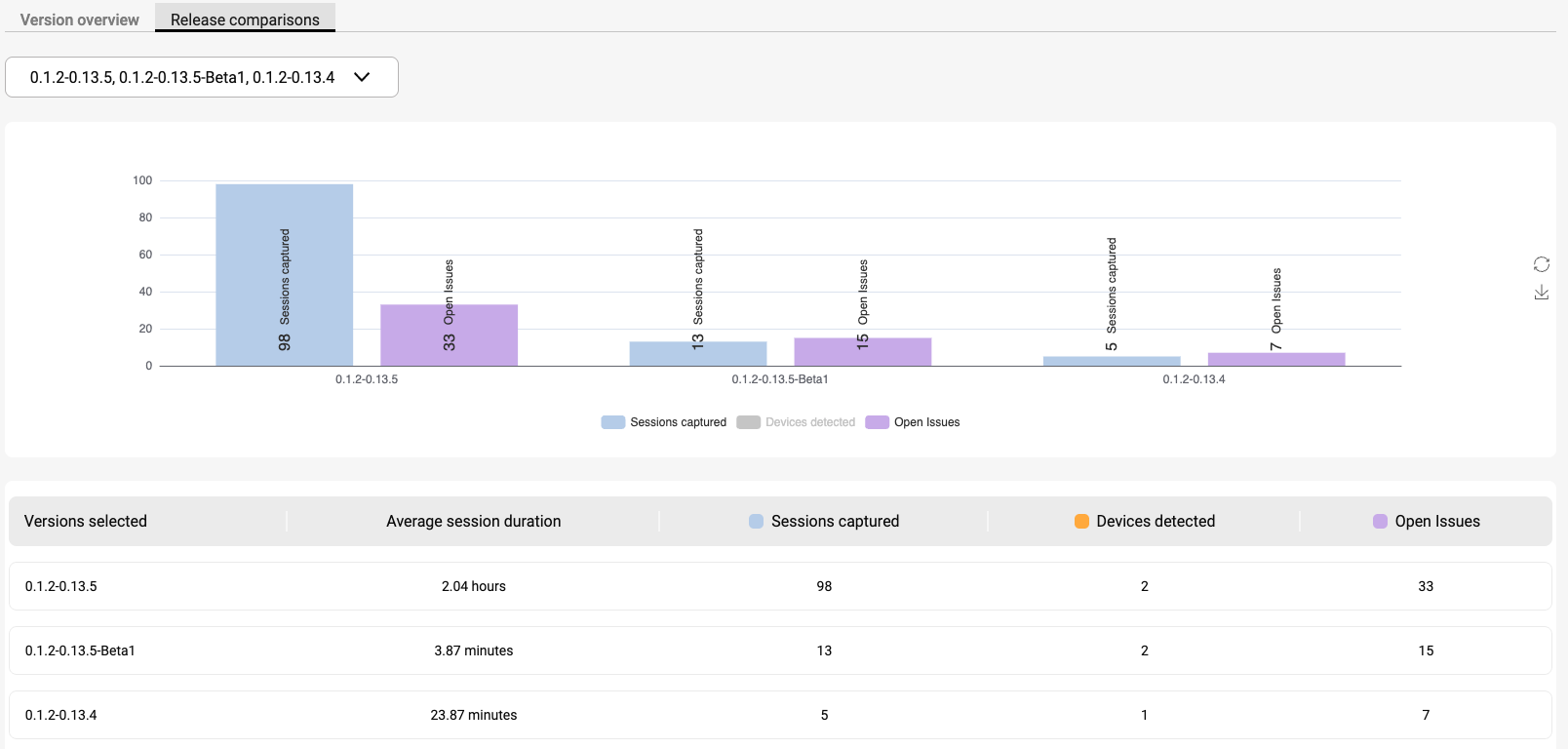 The Dashboard also proposes a second view called Release Comparison that lets you compare the behavior and performance of different app versions to identify regressions or improvements. Metrics available for comparison include total user sessions, number of issues detected, number of affected devices, average session duration and main components impacted.