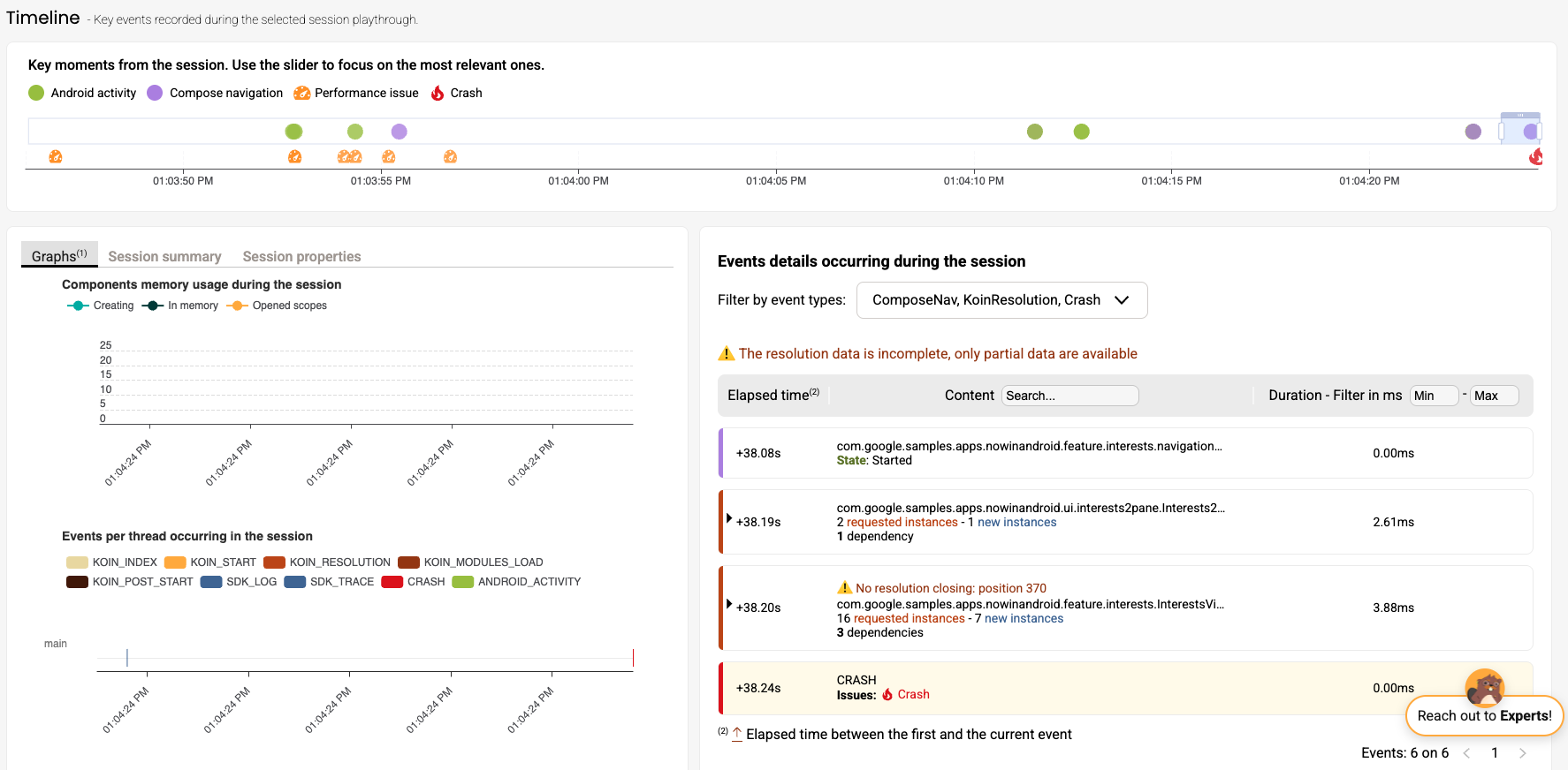The Kotzilla Console provides comprehensive crash tracking with detailed analytics, user session timelines, stack traces, device context, and trends over time.