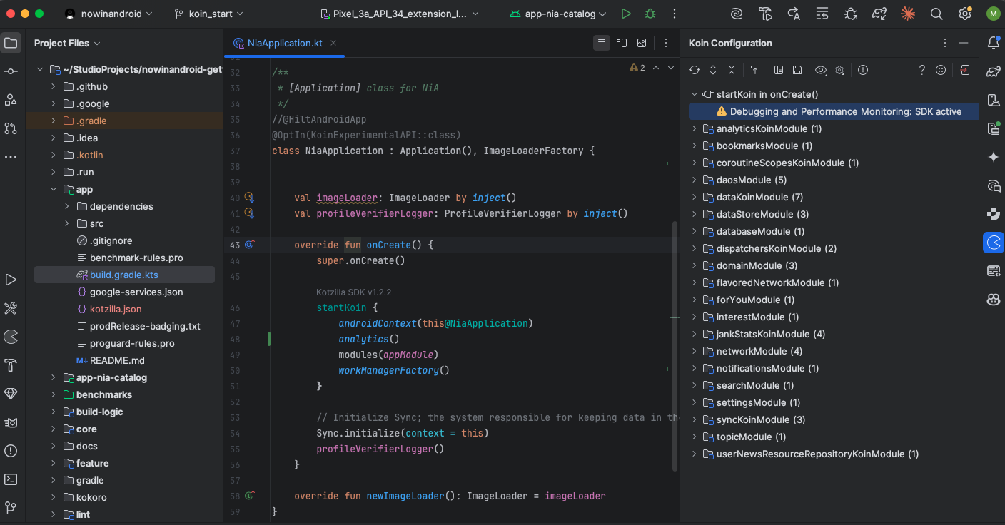 startKoin in onCreate()entry to see that the SDK initialization (analytics()function) has been added to yourNiaApplication.ktclass.