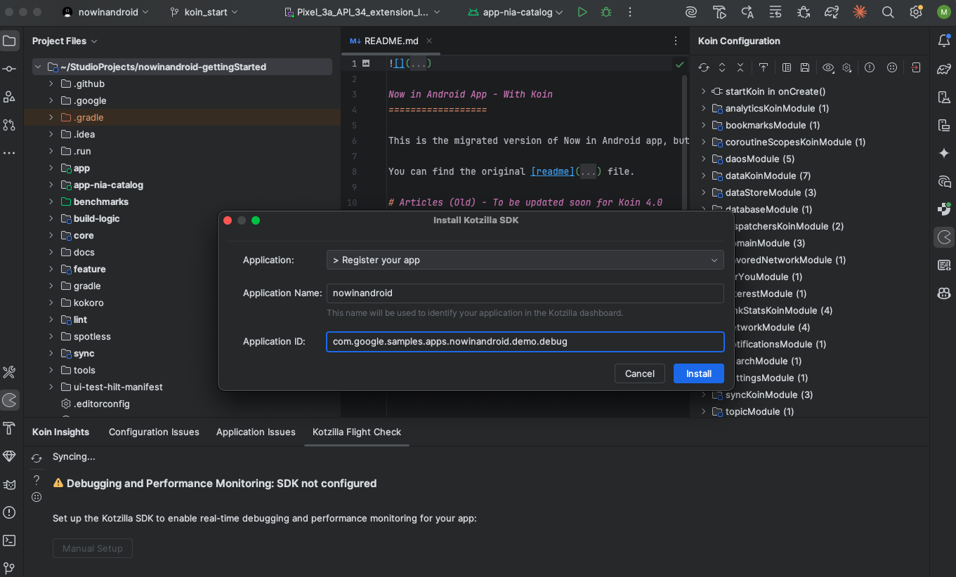In this guide, we’ll use the Quick Setup as described in the Koin IDE Plugin, which is the fastest way to get started with the NowInAndroid sample app: